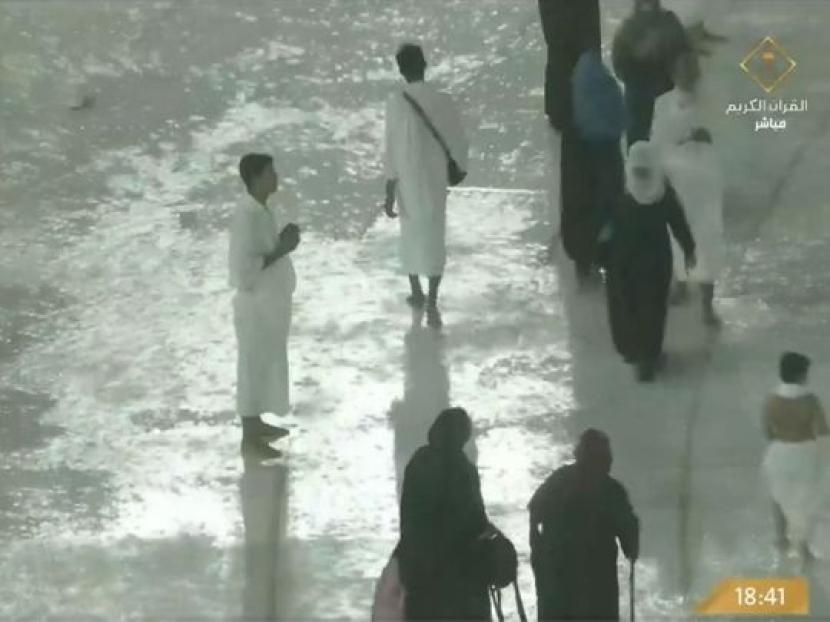 Arab Saudi, Globalindo.net // Beredar video menunjukan suasana dan kondisi di pelataran Masjidil Haram di Makkah yang diguyur hujan dan diterpa angin kencang.Tampak jamaah di pelataran Masjidil Haram berlarian, sekat atau pembatas jalan bagi pejalan kaki di pelataran Masjidil Haram juga dalam posisi jatuh setelah diterpa angin kencang.