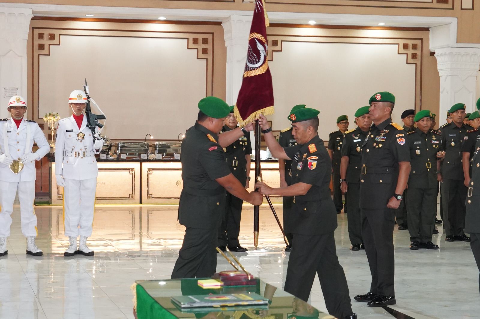 Kegiatan berlanjut pada malam hari, dengan acara malam Lepas Sambut yang digelar di Aula Bhaskara Korem 084/BJ.