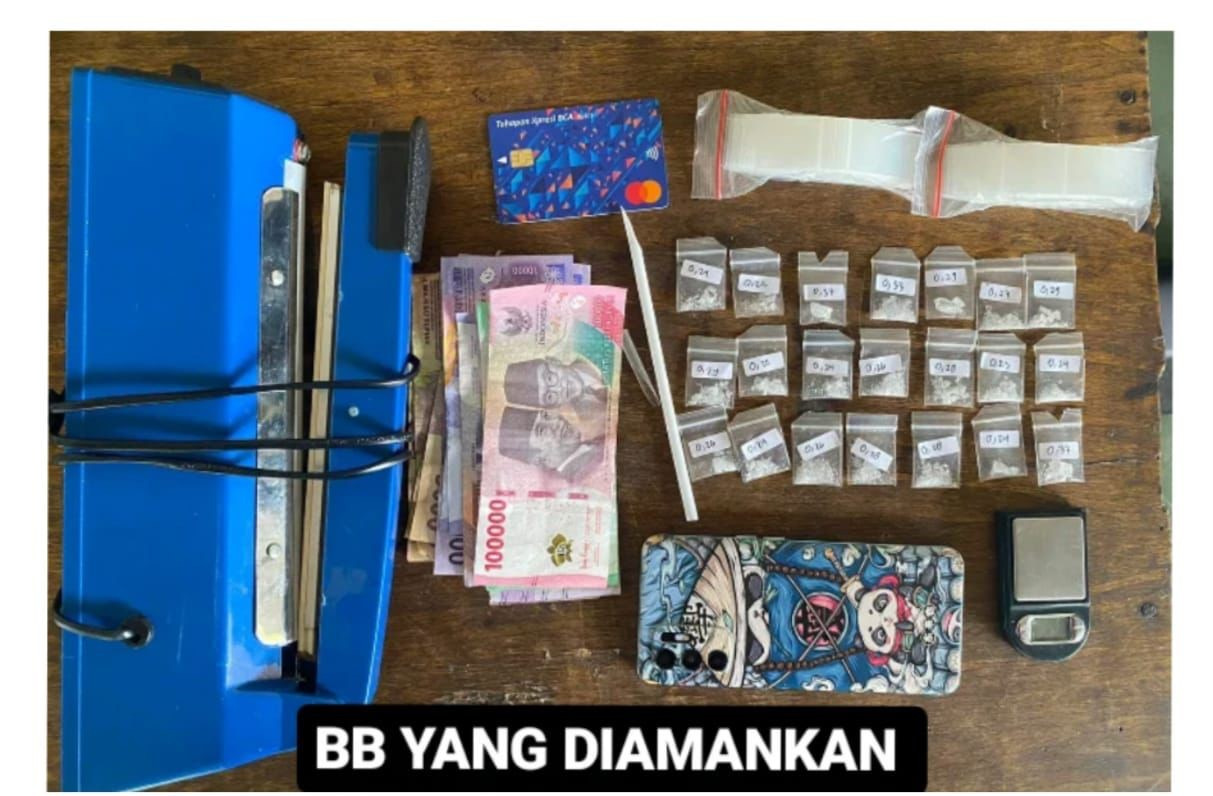 Dari tangan tersangka polisi mengamankan barang bukti sabu 21 poket siap edar. Kini Polisi masih memburu bandar sabu tersebut.