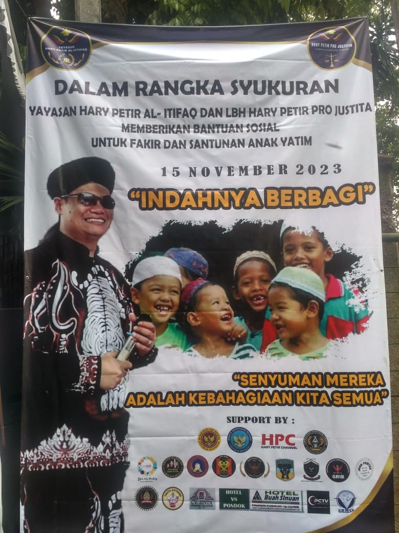 “Dalam kesempatan ini, berdasarkan hasil rembukan dan juga masukan dari Tedhy Lesmana atau pak Jon bahwa Yayasan Hary Petir Al-Itifaq serta LBH Hary Petir Pro Justita harus bisa berbuat kepada masyarakat, yang salah satunya hari ini terkumpul 360 anak yatim serta 250 fakir.