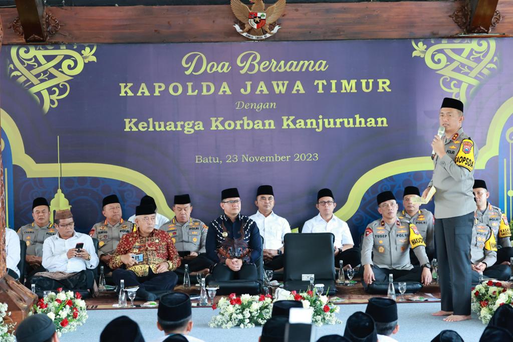 BATU//Globalindo.net – Kapolda Jawa Timur Irjen Pol Drs. Imam Sugianto,M Si didampingi Waka Polda Jatim Brigjen Pol Akhmad Yusep Gunawan serta pejabat utama (PJU) Polda Jatim dan Forkopimda se Malang Raya menggelar doa bersama dengan keluarga korban tragedi Kanjuruhan di Pendopo Rumah Dinas Walikota Batu, Kamis (23/11/23).