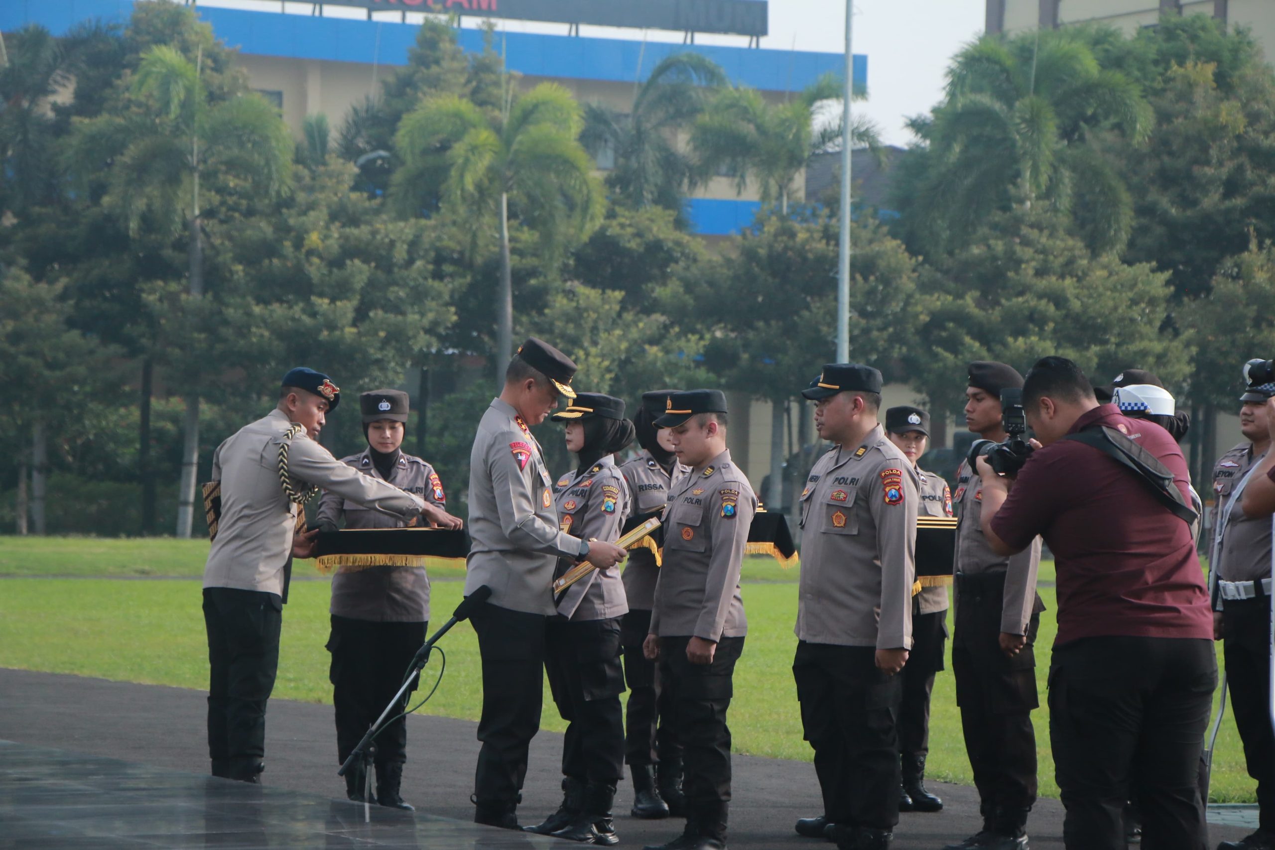 Disaksikan seluruh pejabat utama ( PJU ) dan personel Polda Jatim, penghargaan diberikan oleh Kapolda Jatim pada saat Apel pagi gabungan Satker di Lapangan Apel Mapolda Jatim, Senin (8/1/2024).