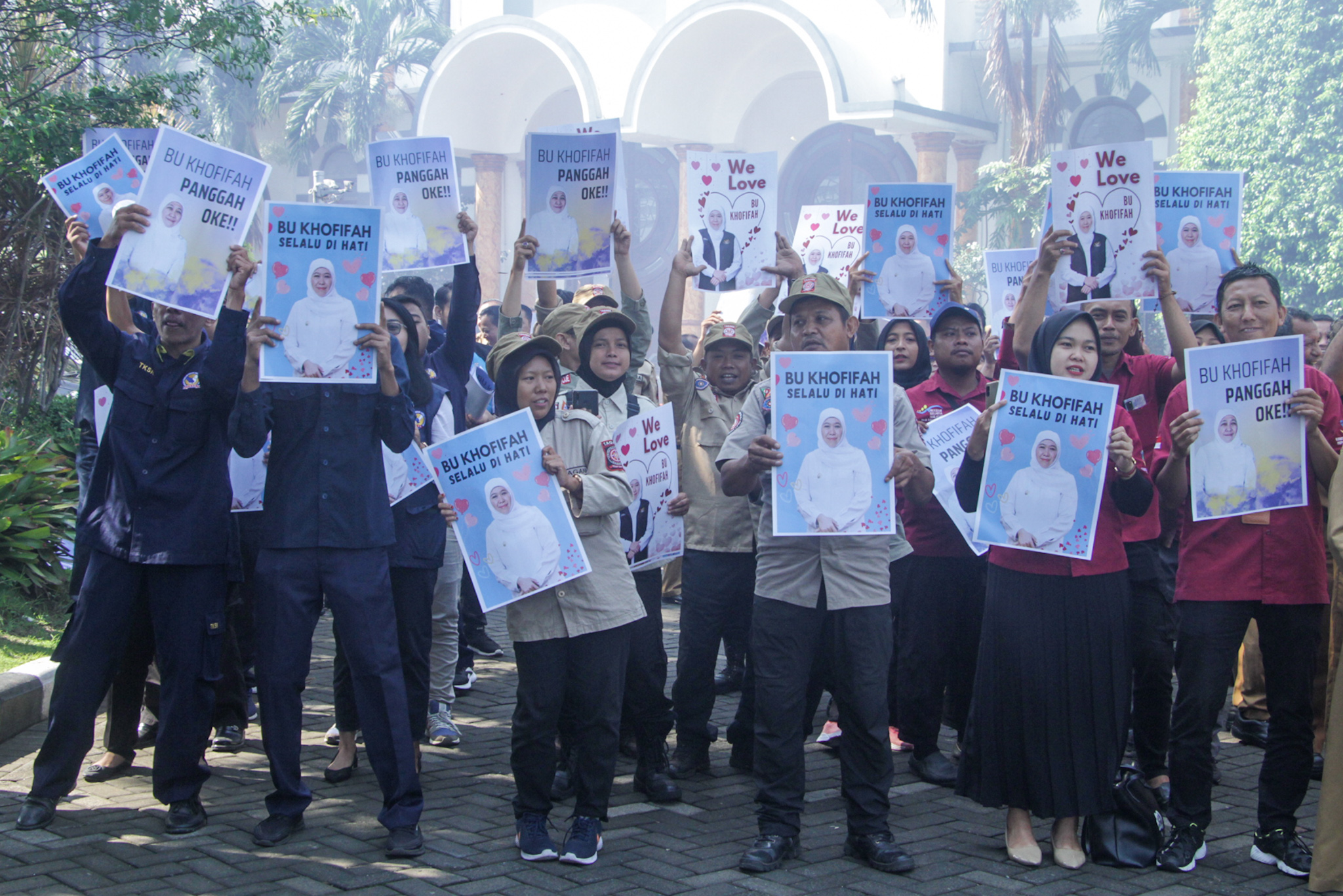 Dari pantauan Globalindo.Net, sejumlah poster yang dibawa para ASN mewarnai suasana apel. Ada yang bertuliskan “Bu Khofifah selalu di hati” hingga “Bu Khofifah panggah oke”. Yang lain ada yang membawa spanduk “Bapak Emil super Cettar” dan “Bunda Khofifah pemimpinku”.