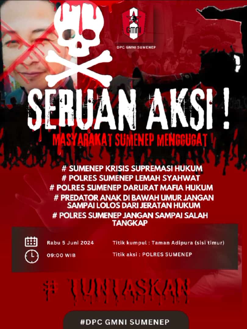 2. GMNI mendesak Polres Sumenep untuk segera melakukan penangkapan terhadap terduga pelaku dalam waktu dekat ini.