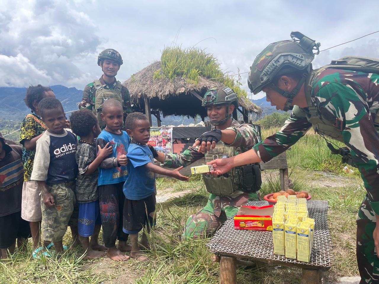 [ SINAK PAPUA ].Globalindo.Net//. Peduli dengan tumbuh kembang anak-anak, Satgas Mobile Yonif 323/BP melalui Pos Sinak Bandara membagikan susu dan telur kepada anak-anak Kampung Gigobak, Distrik Sinak, Kabupaten Puncak, Papua, Senin (10/06/2024)