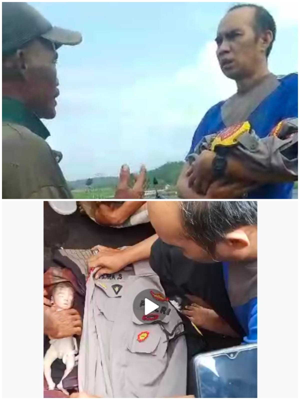 Dalam video lain, nampak Aipda Hendra menggendong jasad bayi yang dibungkus seragamnya itu seakan menimang sambil menunggu kendaraan untuk evakuasi ke rumah sakit. Akhirnya dia terlihat berboncengan motor dengan Babinsa setempat membawa jasad tersebut.