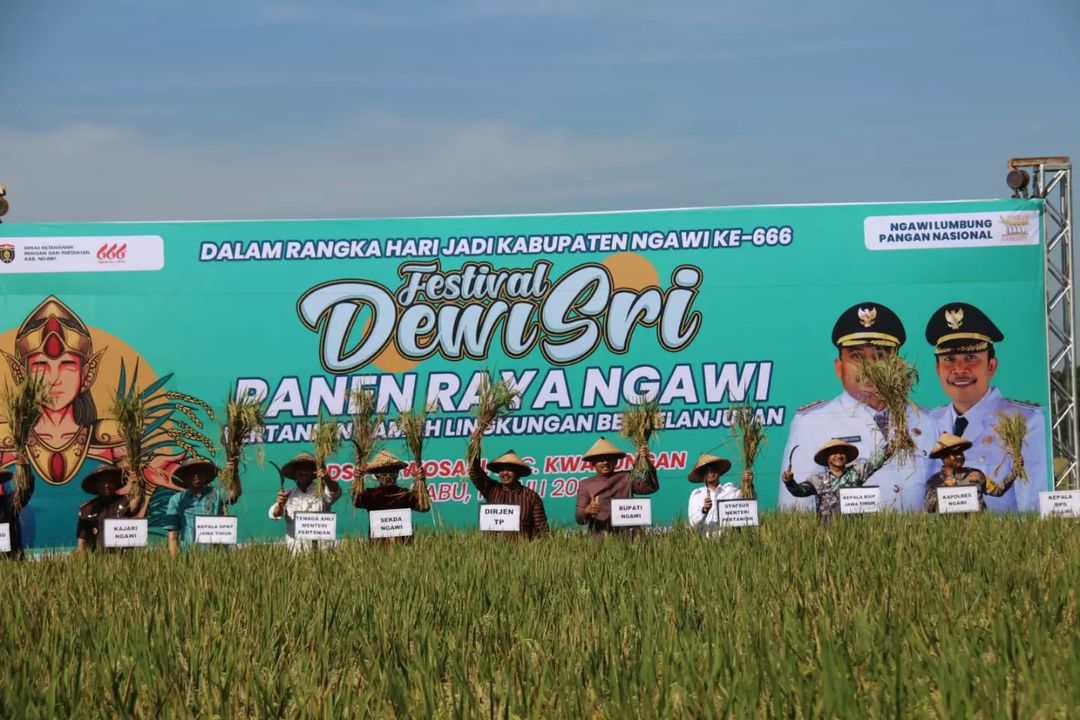 Ngawi.Globalindo.Net// Bupati Ngawi, Ony Anwar Harsono menghadiri Festival Dewi Sri Panen Raya dalam rangka Hari Jadi Ngawi ke-666 yang diadakan di Desa Purwosari Kec. Kwadungan, Rabu (10/07/24).