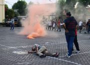 Pada simulasi itu juga dibuat skenario adanya Ban mobil yang dibakar di tengah jalan oleh pendemo lalu dengan sigap petugas Damkar datang dan langsung melakukan pemadaman api dengan cepat sampai kobaran apinya padam.