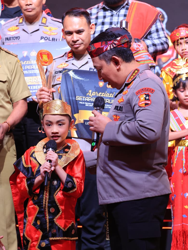 Saat memberikan piala penghargaan, Jenderal Sigit pun menyempatkan menyapa anak-anak pemenang lomba cerpen. Salah satunya adalah Leticia Sara Angeline Harefa yang menjadi juara satu lomba cerpen asal Sumatra Utara.