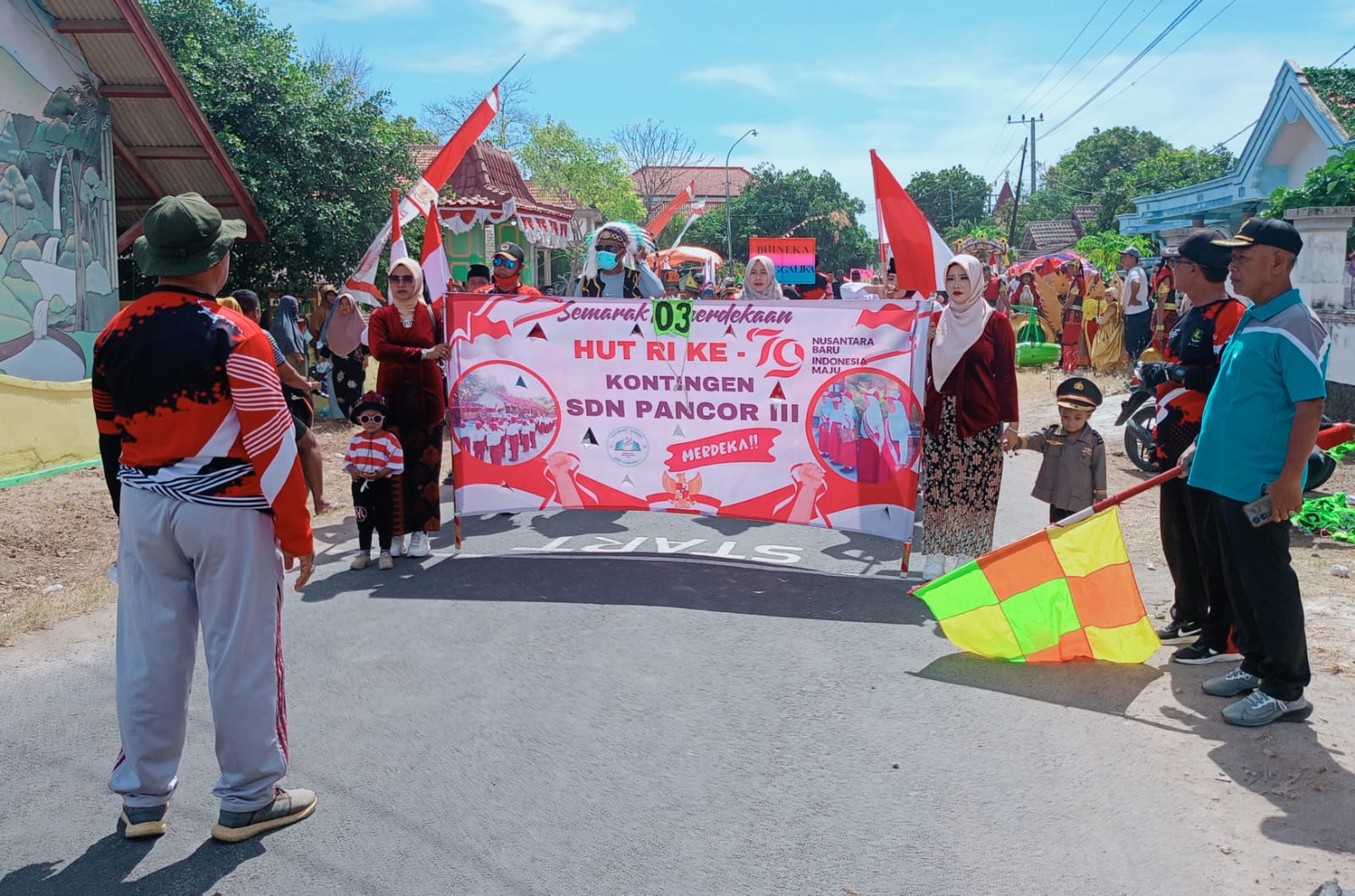 Terlihat siswa-siswi SDN 3 Pancor telah berkumpul sejak jam 12:00 WIB dan mendapatkan nomor urut nomer 3 yang langsung didampingi oleh para dewan gurunya serta menampilkan berbagai macam kostum untuk memeriahkan HUT RI ke_79 Tahun.