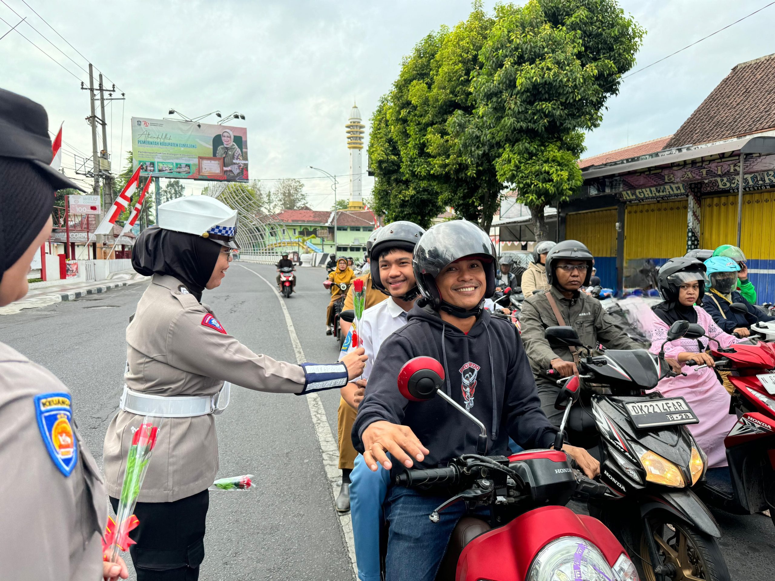 Kali ini para Srikandi Bhayangkara Polres Lumajang itu tampak beraksi di sepanjang jalan raya dengan berbagi bunga kepada pengendara.