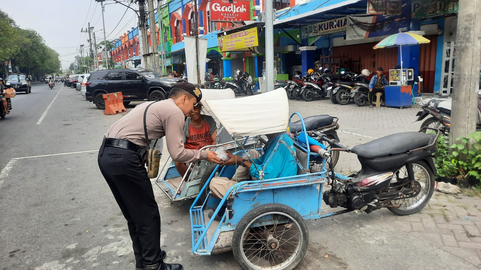 Meskipun tengah bertugas, anggota polisi di Sidoarjo menggiatkan peduli sosial dengan berbagi ke warga yang membutuhkan melalui program ‘Samapta Delta Peduli’.