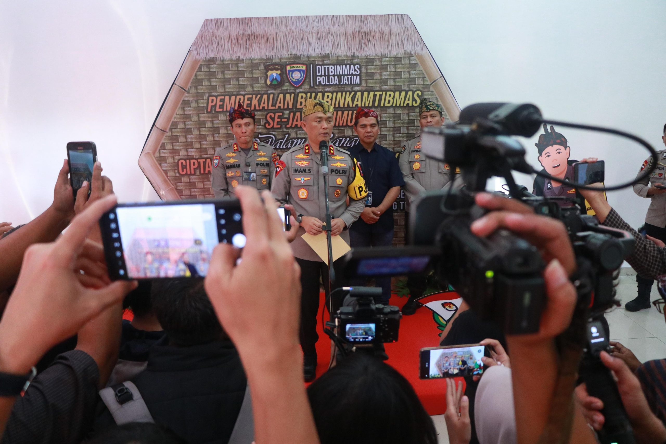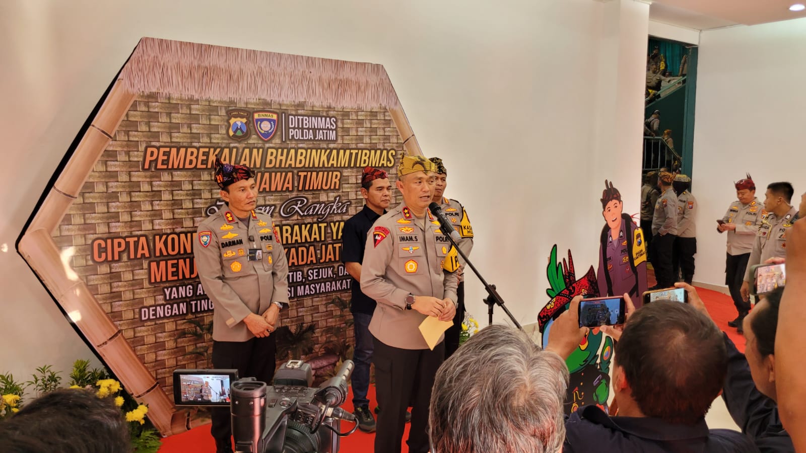 SURABAYA – Globalindo.Net// Kapolda Jawa Timur, Irjen Pol Drs Imam Sugianto, M.Si resmi menutup kegiatan pembekalan Bhayangkara Pembina Keamanan dan Ketertiban Masyarakat (Bhabinkamtibmas dalam rangka Pemilukada serentak di Jawa Timur tahun 2024.