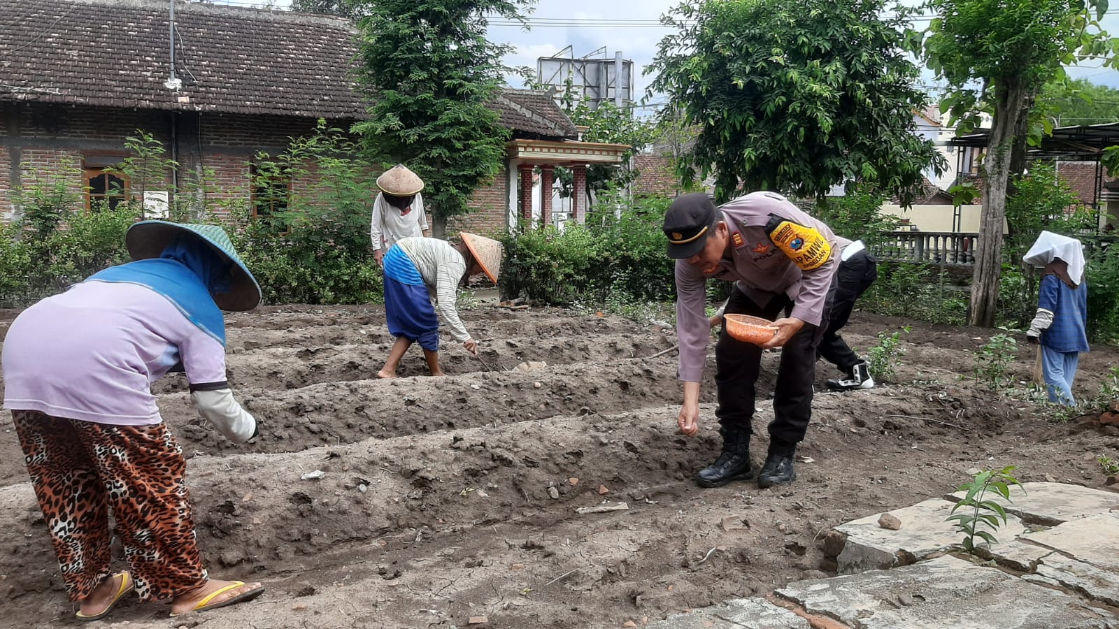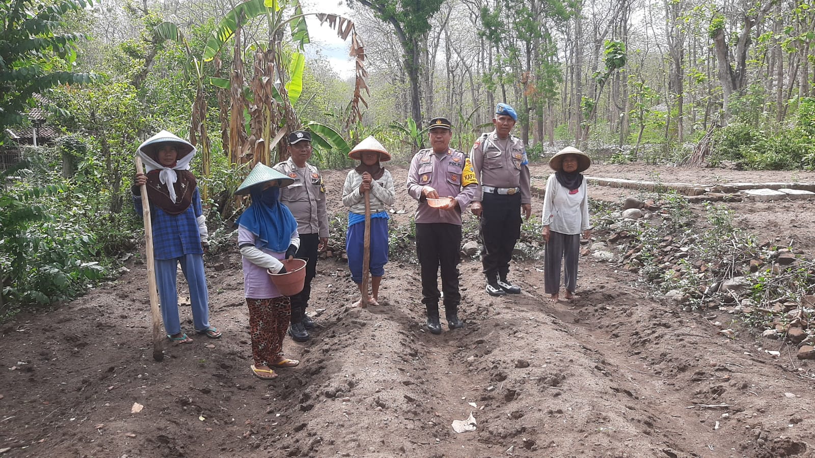 Dalam suasana gotong royong, warga dan anggota Polsek Badegan bekerja sama menanam bibit jagung di lahan-lahan yang telah dipersiapkan.