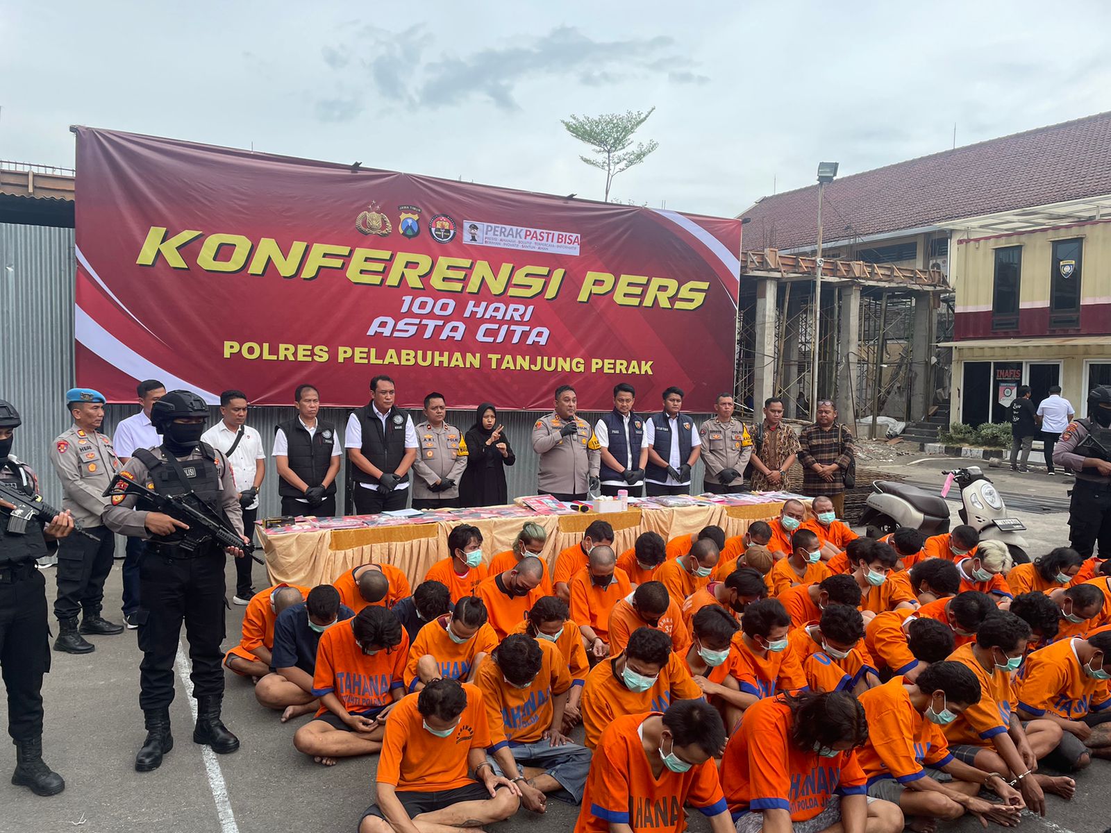 Kapolres Pelabuhan Tanjung Perak AKBP William Cornelius Tanasale mengungkapkan dari operasi tersebut, Polisi menyita barang bukti berupa 129,98 gram sabu-sabu, 533,71 gram ganja, sembilan butir ekstasi, 1.970 butir obat keras jenis pil LL, uang tunai sebesar Rp1.910.000, serta 30 ponsel yang digunakan untuk aktivitas transaksi.