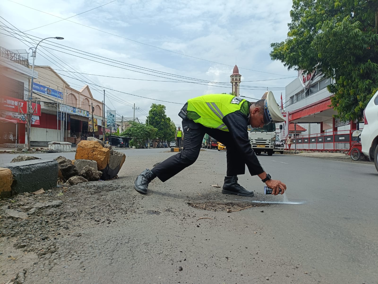 Pihak Kepolisian menyemprotkan cat di sekeliling jalan berlubang dan bergelombang sebagai penanda bagi pengguna jalan.