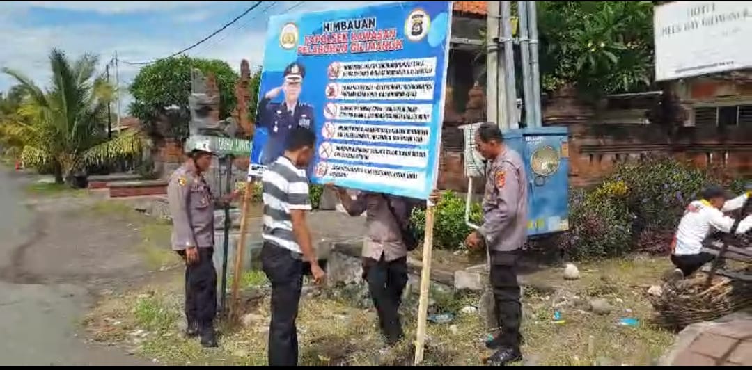 Dalam kegiatan tersebut, hadir AKP Ida Bagus Ketut Trisana, S.H. (Wakapolsek), Aiptu I Putu Eka Suprayadnya (Kasium), dan Brigadir Teguh Santoso (Bhabinkamtibmas). Mereka juga dibantu oleh dua warga setempat untuk memastikan pemasangan baliho berjalan lancar.