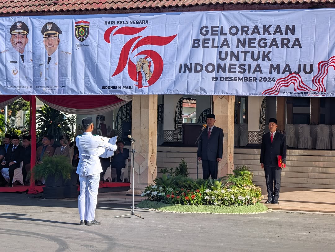 Ngawi, Globalindo.Net // Upacara peringatan Hari Bela Negara ke-76 Wakil Bupati Ngawi,Dwi Riyanto Jatmiko menjadi inspektur upacara, yang berlangsung khidmat di halaman Pendopo Widya Graha, Kabupaten Ngawi, Kamis (19/12/24).