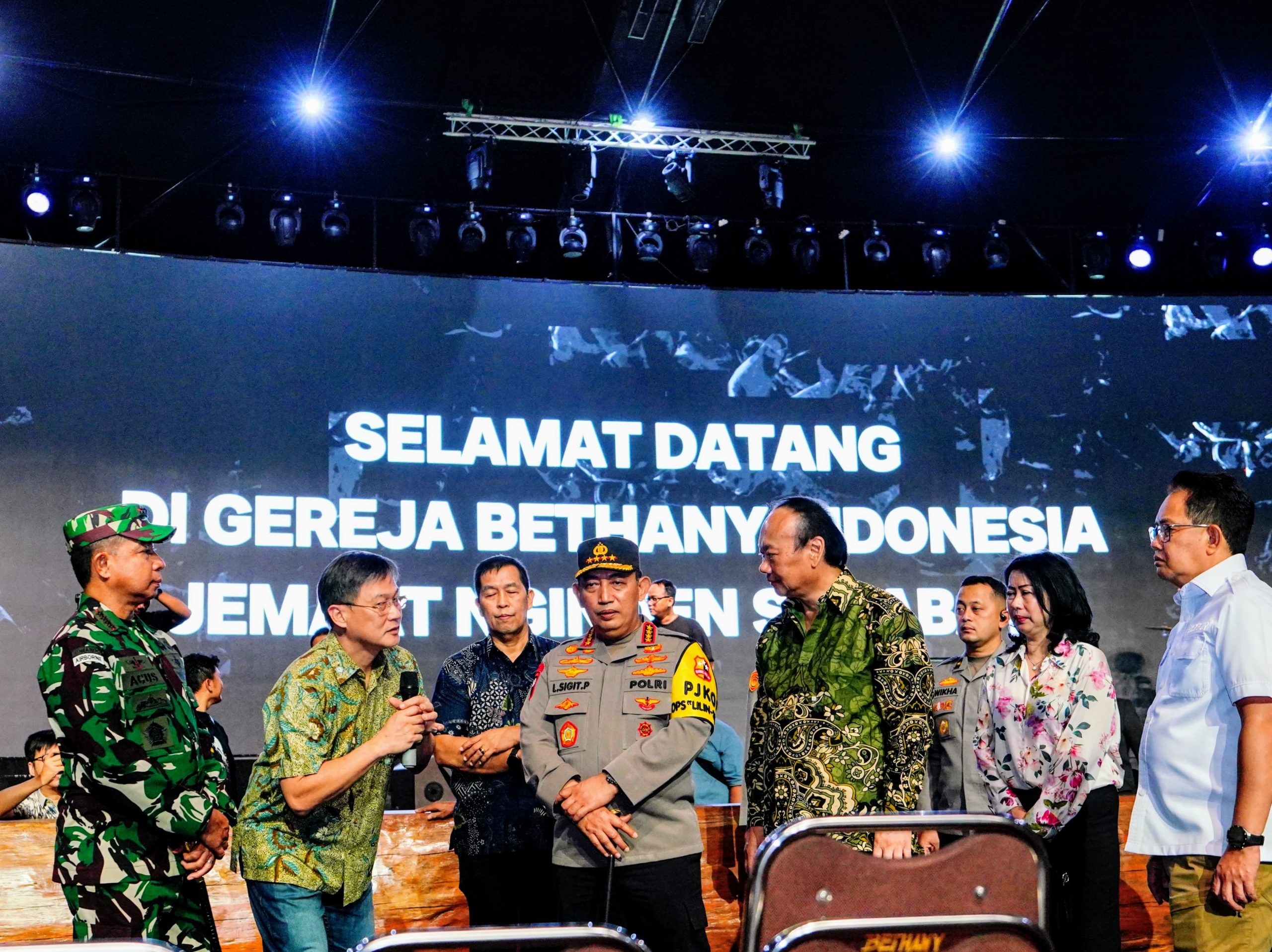 Turut mendampingi Kapolri, Irwasum Polri Komjen. Pol. Dedi Prasetyo, Dankorbrimob Polri Komjen. Pol. Imam Widodo, Kadiv Propam Polri Irjen. Pol. Abdul Karim, Kadiv Humas Polri Irjen. Pol. Sandi Nugroho, Kakorlantas Irjen. Pol. Aan Suhanan, dan Kapusdokkes Polri Irjen. Pol. Asep Hendradiana. Kapolri pun disambut oleh Gembala Sidang Gereja Bethany Nginden, Pdt. Aswin Tanuseputra, Wakil Gembala Sidang Gereja Bethany Nginden, Joshua Tanuseputra, Dewan Rasuli Sinode Gereja Bethany Se-Indonesia, Pat. Willy Josep, Dewan Rasuli Sinode Gereja Bethany se-Indonesia, Pdt. Lukas Lukman, Penatua Gereja Bethany Nginden, Pdt.