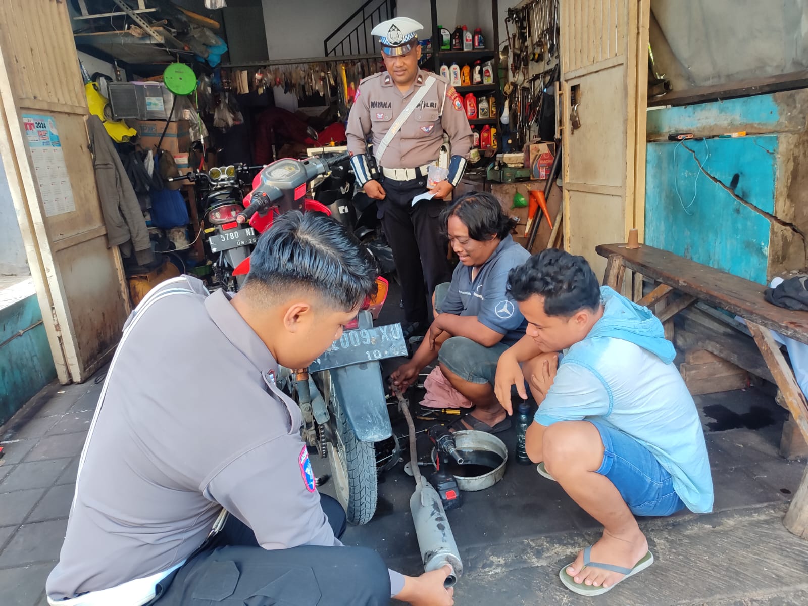 Dalam sosialisasi ini, petugas memberikan pemahaman kepada mekanik bengkel tentang aturan larangan penggunaan knalpot tidak standar sesuai Undang-Undang Lalu Lintas.