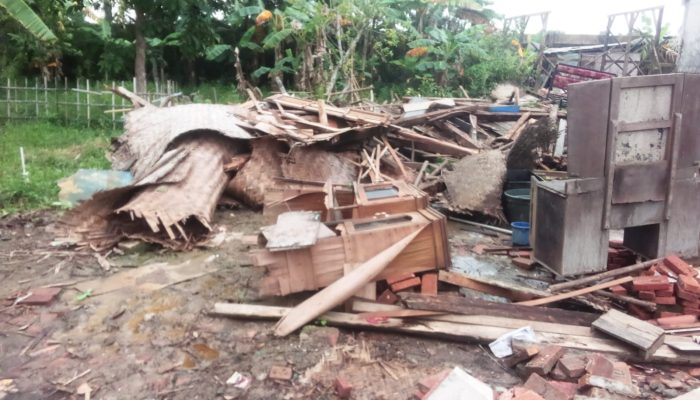 Berdinding bata satu meter dengan keatasnya bilik bambu, atap yang tidak berplapon juga genting yang sudah pada bocor, kini rumah tua itu tidak mampu menahan beban dari atas akibat tekanan guyuran derasnya air hujan, dengan kondisi kayu yang sudah lapuk sehingga mengakibatkan rangka atap kayu dibagian tengah rumah tersebut ambruk, pada senin 10/02/2025