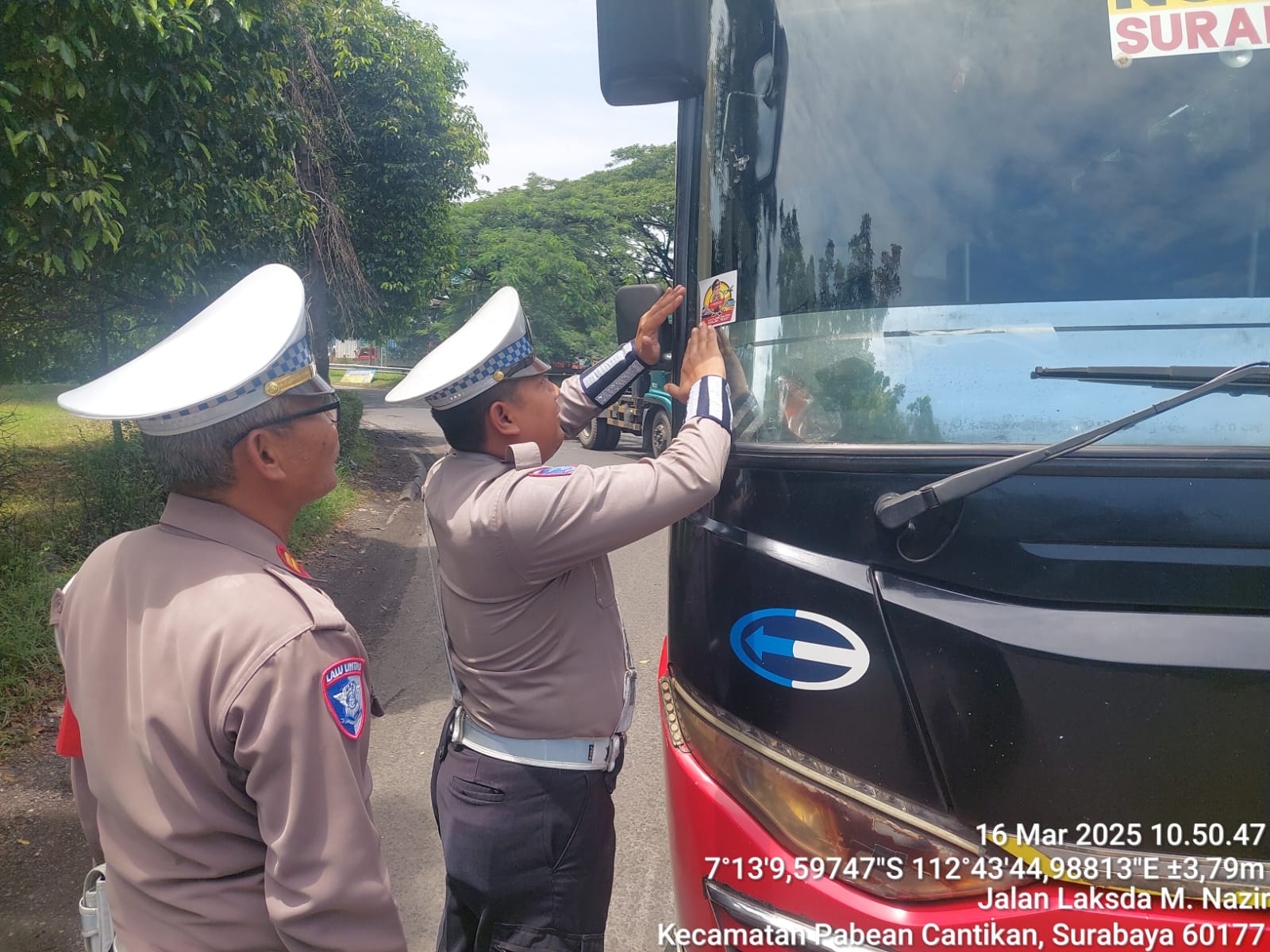 Demi mengimplementasikan arahan Kapolri Jendral Polisi Listyo Sigit Prabowo dalam rangka memberikan pengamanan serta pelayanan menjelang mudik lebaran, Kasat Lantas Polres Pelabuhan Tanjung Perak AKP Imam Syaifuddin Rodji menggelar acara penempelan stiker Tagline dan Hotline mudik Polri 110 di kendaraan umum seperti Buss.