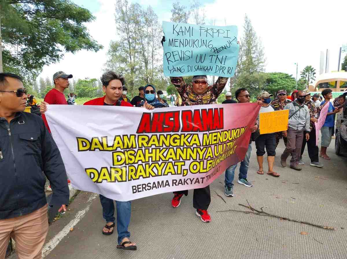 Unjuk rasa berlangsung dengan tertib Massa menyampaikan aspirasi, salah satunya adalah dukungan terhadap revisi Undang-Undang Tentara Nasional Indonesia (UU TNI) yang telah disahkan oleh DPR RI.