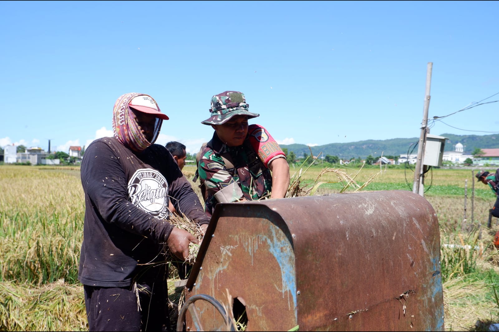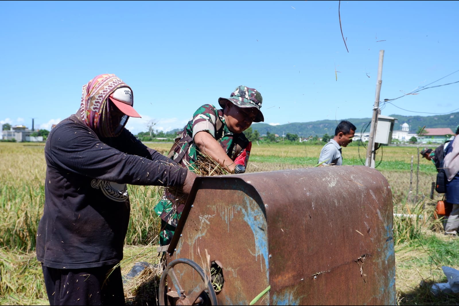 Serda Wahyu menyampaikan wujud dukungan TNI khususnya prajurit kewilayahan Kodim 0801/Pacitan dalam hal ini Babinsa guna mendukung ketahanan pangan, dengan Semangat ikut serta terjun langsung ke sawah dalam membantu para petani desa binaannya saat memanen padi.