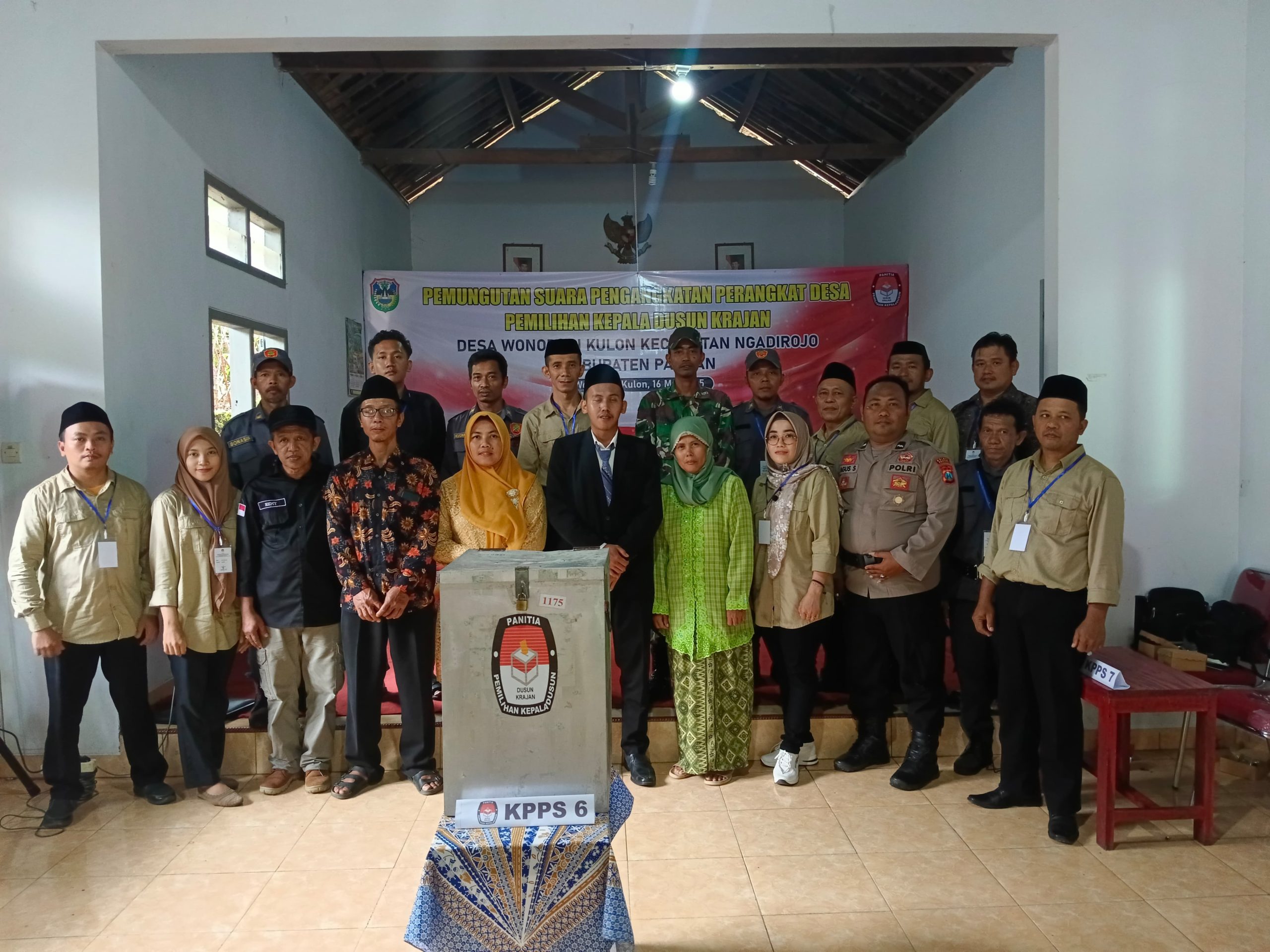 Pacitan, -Globalindo.Net// Komandan Koramil 0801/07 Ngadirojo Kapten Cba Yuswanto memantau pelaksanakan pengamanan kegiatan pemungutan suara Pemilihan Kepala Dusun (Pilkasun) Krajan di Desa Wonodadi, Kecamatan Ngadirojo, Kabupatan Pacitan. Sabtu (17/05/2025).
