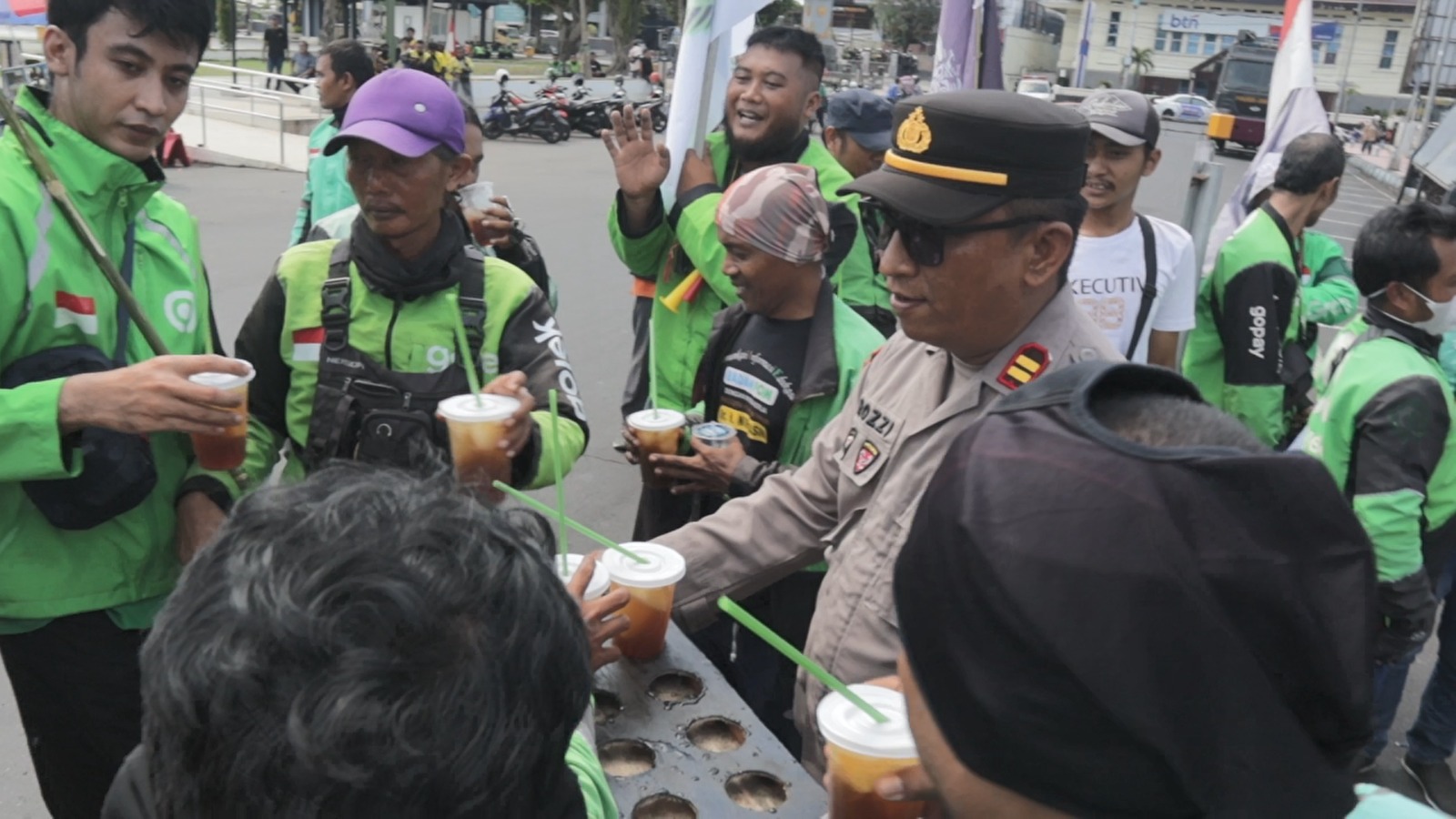 Sontak, suasana menjadi hangat secara emosional. Para driver online berbondong-bondong mendekati petugas untuk mendapatkan minuman pelepas dahaga itu.