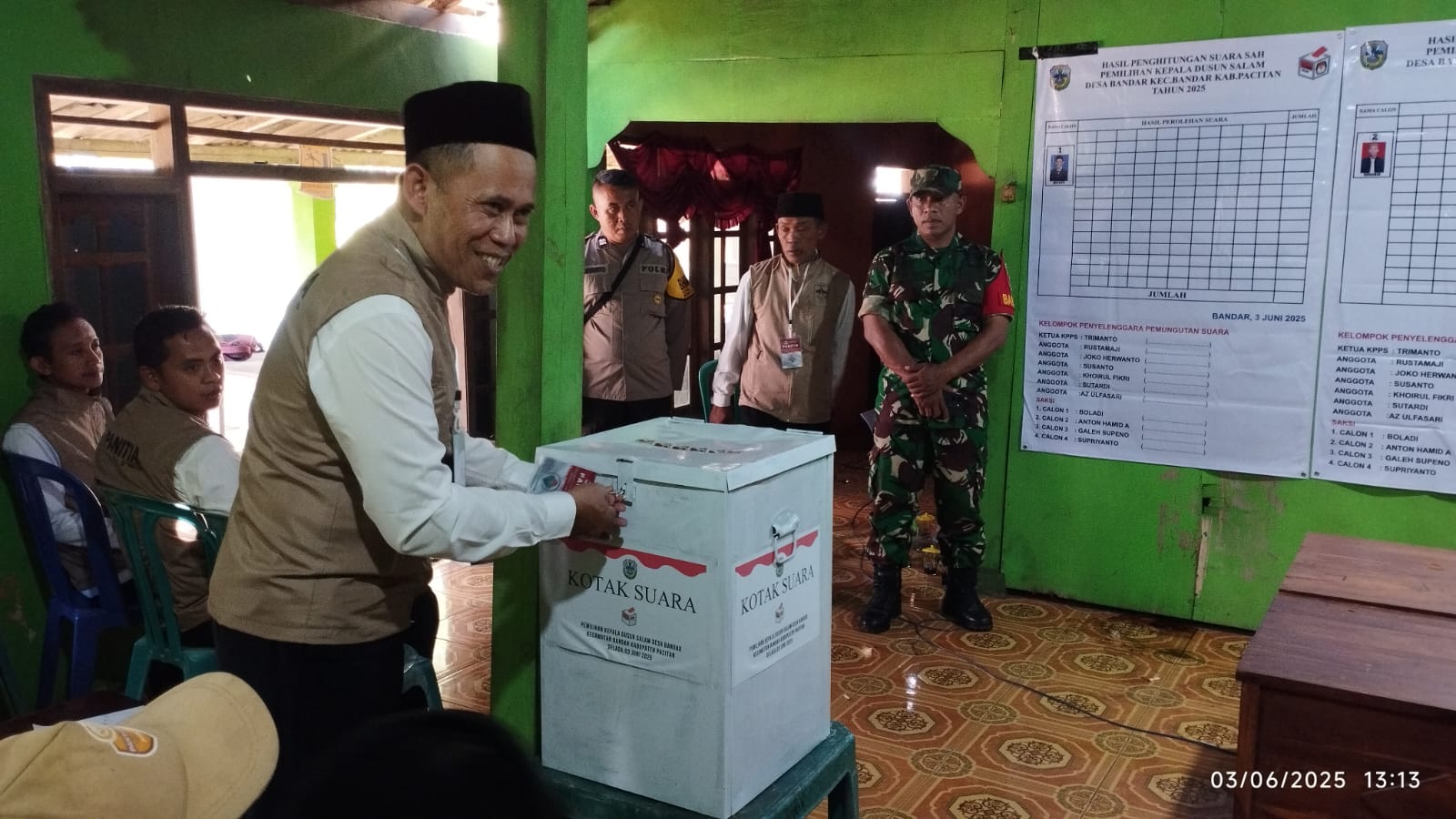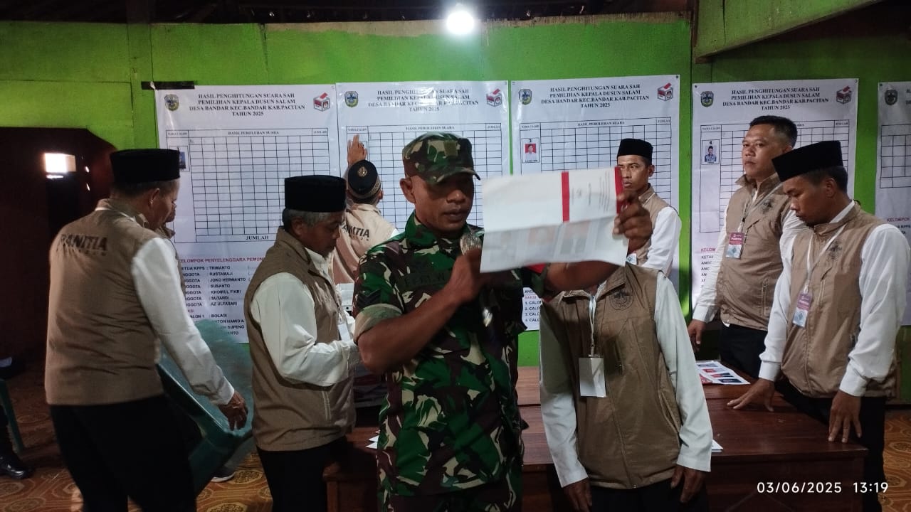 Pacitan – Globalindo.Net// Dalam upaya mensukseskan pemilihan Kepala Dusun Salam, Koramil 0801/06 Bandar Kodim 0801/Pacitan Serka Feri menghadiri tahapan pemilihan kepala Dusun Salam, bertempat di Balai Dusun Salam, Desa Bandar, Kecamatan Bandar, Kabupaten Pacitan, Rabu (4/6/2025).