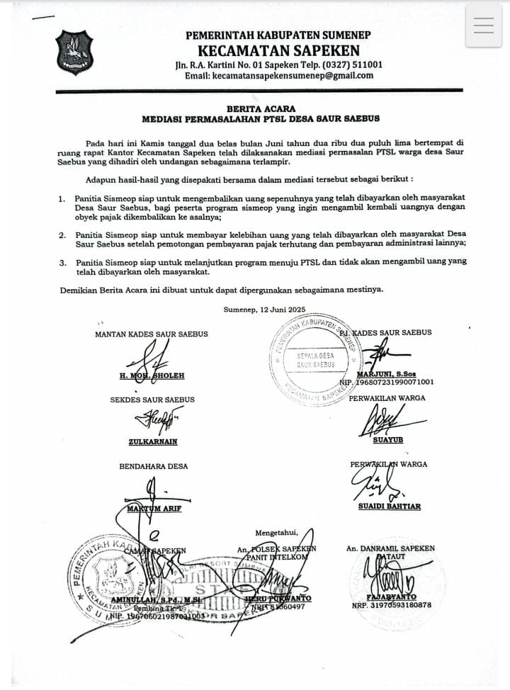 Tiga dari poin hasil dari musyawarah tersebut ditandatangani oleh berbagai unsur, mantan kades (H.Moh Sholeh) PJ kades Saur Saebus (Marjuni S.sos) perwakilan warga (Suayub) camat Sapeken (Aminullah) Polsek Sapeken Panitia Intelkom (Heru Purwanto) Danramil Sapeken (Fajar Yanto) dan semua peserta lainnya yang ikut menandatangani