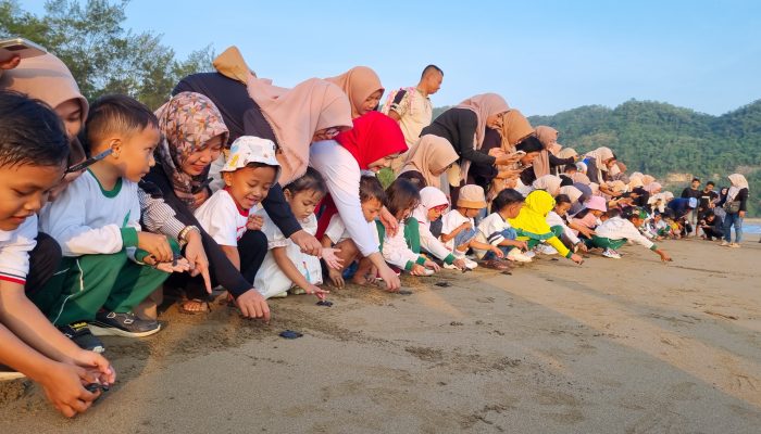 Seperti yang dilakukan Pesanggrahan Berkah Penyu Pacitan melepasliarkan ratusan anak penyu atau tukik bersama anak-anak TK Kartika IV-18 Pacitan di Kabupaten Pacitan pada Jumat (8/8/2025) sore di kawasan Pantai Pancer Dorr, Kelurahan Ploso, Pacitan.