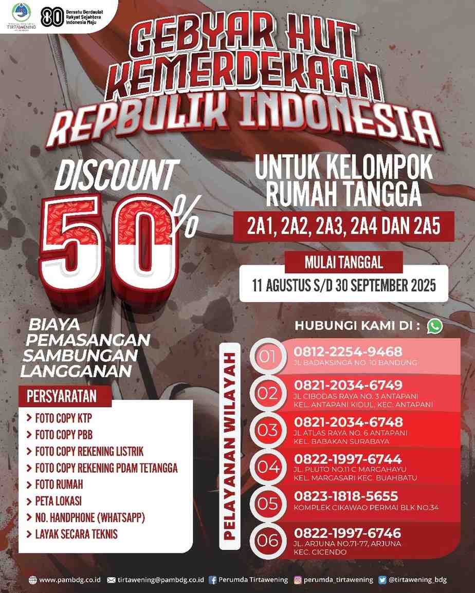 BANDUNG, Globalindo.Net – Peringati HUT Kemerdekaan Republik Indonesia Perumda Tirtawening kembali berikan kejutan untuk warga bandung bagi pelanggan baru untuk kelompok rumah tangga.