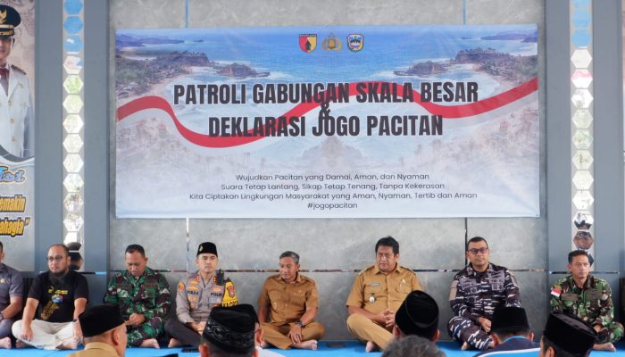 Pacitan – Forum Koordinasi Pimpinan Daerah (Forkopimda) Kabupaten Pacitan bersama unsur TNI, Polri, pemerintah daerah, dan elemen masyarakat menggelar Patroli Gabungan Skala Besar serta Deklarasi Jogo Pacitan pada Selasa (2/9/2025). Kegiatan ini berlangsung di Pendopo Kabupaten Pacitan dan berlanjut hingga Kecamatan Kebonagung.