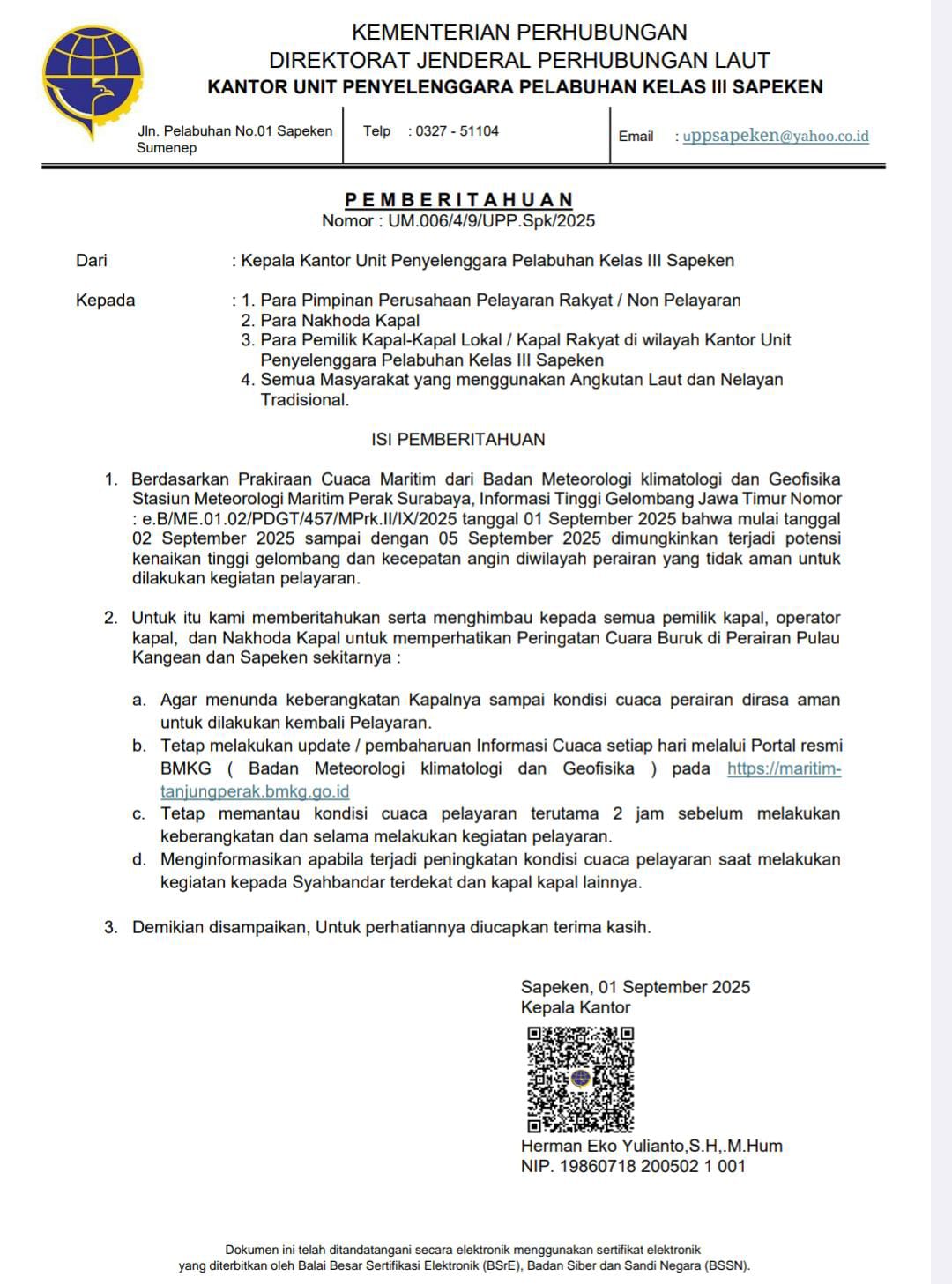 Kepala Kantor UPP Kelas III Sapeken, Herman Eko Yulianto, S.H., M.Hum., menegaskan bahwa berdasarkan prakiraan cuaca dari Badan Meteorologi Klimatologi dan Geofisika (BMKG) Stasiun Meteorologi Maritim Perak Surabaya, pada tanggal 2 hingga 5 September 2025 diperkirakan akan terjadi kenaikan tinggi gelombang dan kecepatan angin. Kondisi ini berpotensi membahayakan pelayaran, khususnya bagi kapal rakyat, kapal lokal, serta nelayan tradisional.