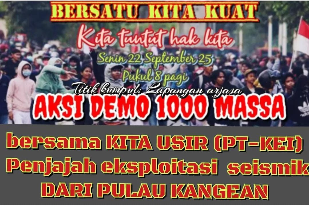 Poster itu memuat ajakan turun ke jalan pada Senin, 22 September 2025, pukul 08.00 pagi dengan titik kumpul di Lapangan Arjasa. Narasi di dalamnya menegaskan seruan untuk mengusir PT Kangean Energy Indonesia (KEI) yang dituding melakukan eksploitasi seismik.