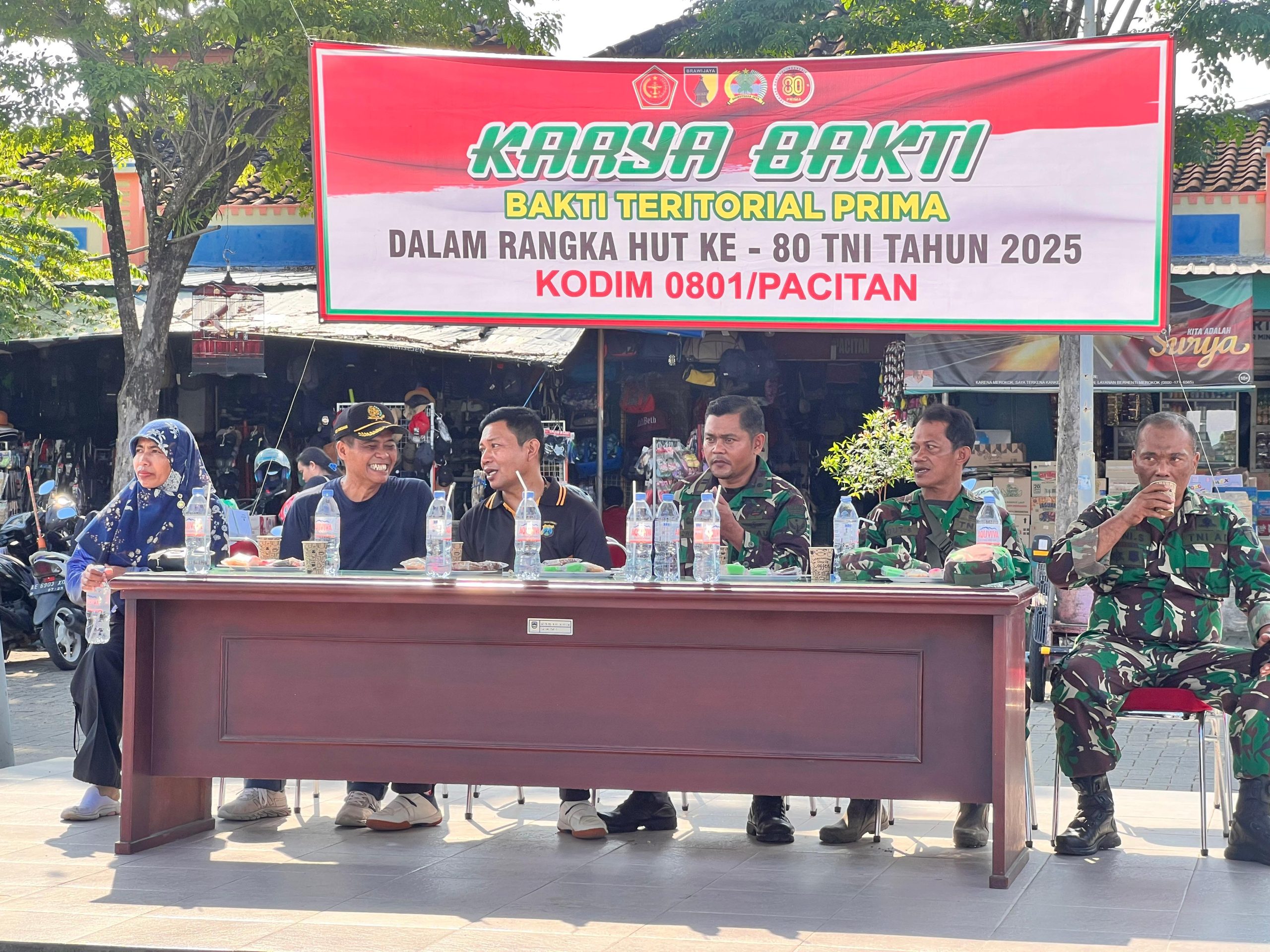 Pacitan, – Dalam rangka memperingati HUT TNI Ke-80, Kodim 0801/Pacitan menggelar aksi kegiatan karya bhakti teritorial pemberian pasar Minulya Pacitan, bertempat bertempat di Pasar Minulyo Kel. Baleharjo Kec/Kab.Pacitan, Jumat (26/9/2025).