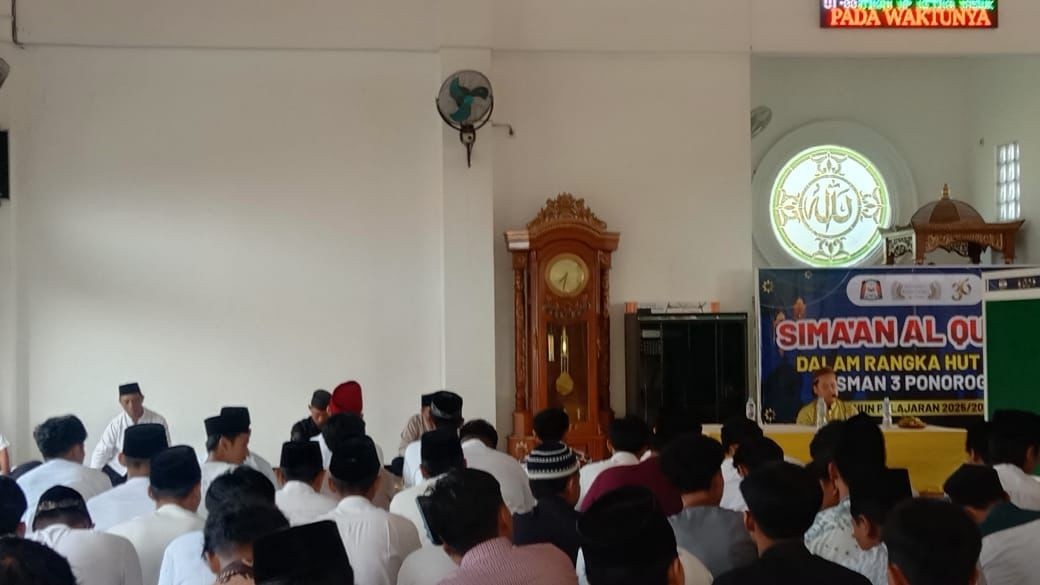 Ponorogo, Globalindo.Net – SMA Negeri 3 Ponorogo memperingati Hari Ulang Tahun (HUT) ke-36 pada tahun pembelajaran 2025–2026 dengan menggelar kegiatan religius berupa simaan Al-Qur’an pada Senin (29/9/2025). Kegiatan berlangsung di lingkungan sekolah dengan penuh khidmat dan diikuti oleh guru serta siswa.