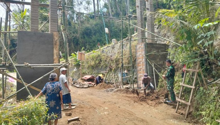 Pacitan, – Anggota Satgas TMMD Kodim 0801/Pacitan bersama warga membuat Gapura Pintu masuk lokasi menuju sasaran Rabat jalan beton bertempat di Dusun Krajan, Desa Petungsinarang, Kecamatan Bandar, Kabupaten Pacitan, Rabu (29/10/2025). Hal ini dilakukan untuk memberikan tanda sekaligus membuat ikon di lokasi Program TMMD Ke-126 Desa Petungsinarang.