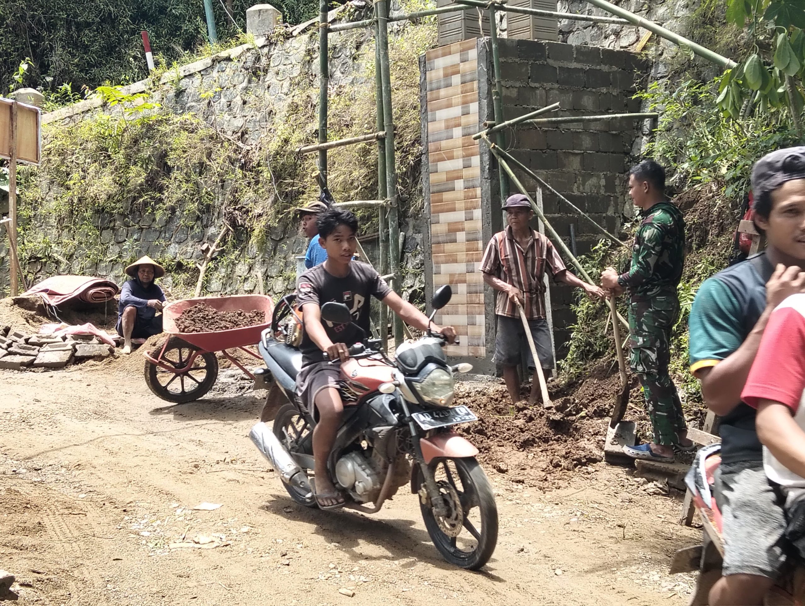 Semangat dan kekompakan Satgas TMMD bersama warga yang tak mengenal rasa lelah. Nampak dalam pengerjaan pembangunan gapura tepatnya di titik yaitu persimpangan jalan masuk dan jalan bagian dalam kampung.