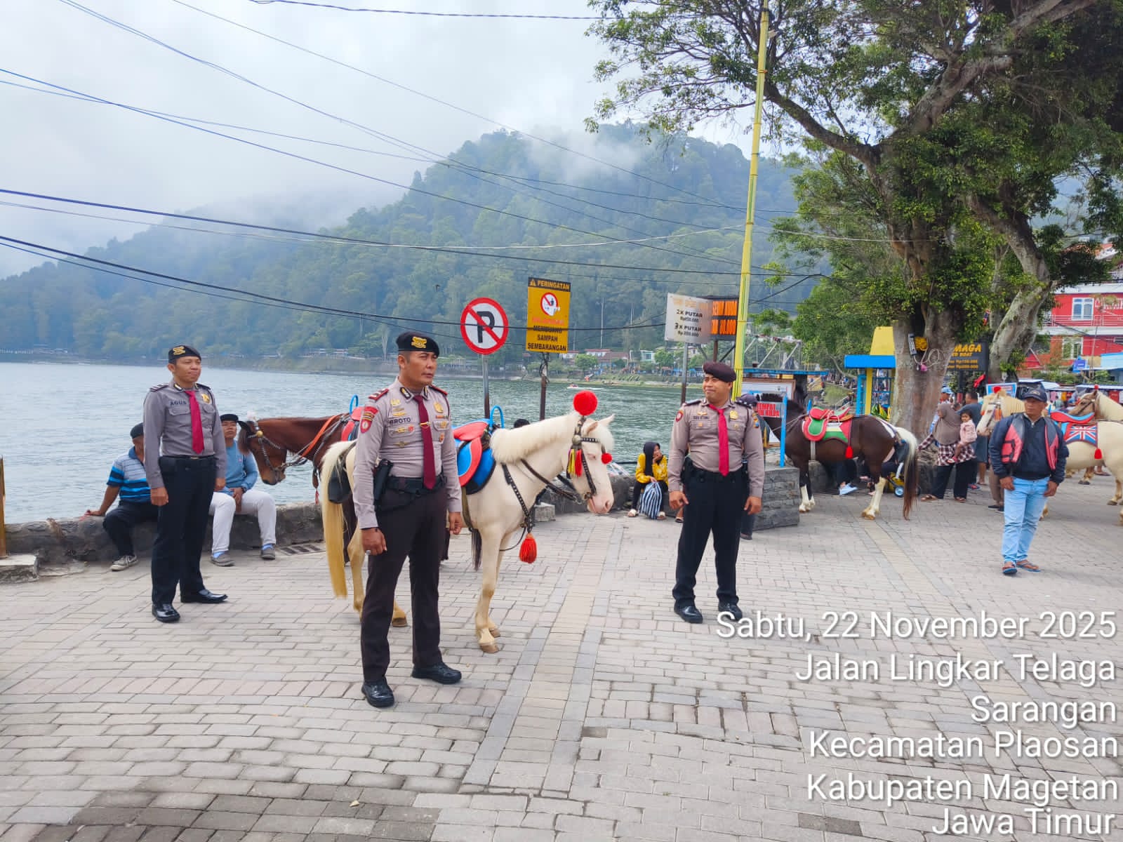 Magetan, Globalindo.Net – Libur akhir pekan di Telaga Sarangan terlihat ramai dengan kedatangan wisatawan dari berbagai daerah. Untuk menjaga keamanan dan kenyamanan para pengunjung, anggota Unit Patroli Polisi Pariwisata Sat Samapta Polres Magetan meningkatkan patroli dan pengamanan di kawasan wisata tersebut pada Minggu (23/11/2025).