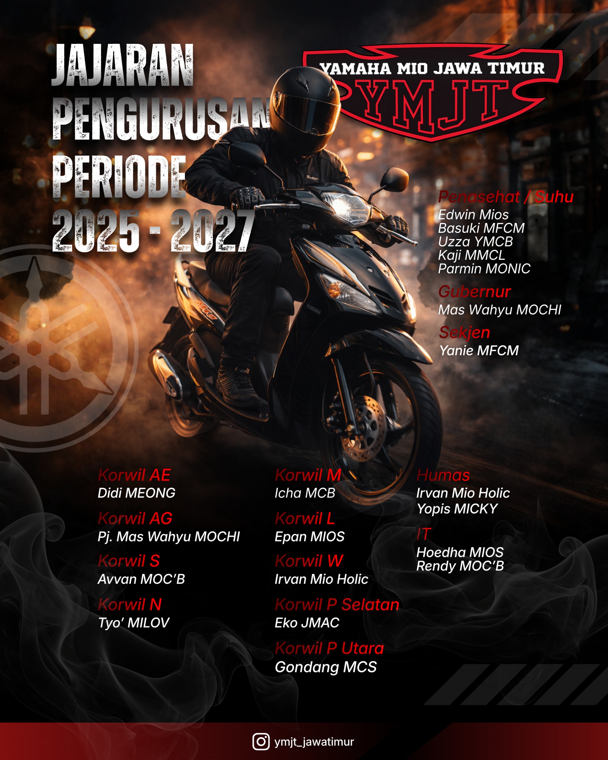 Jawa Timur — Yamaha Mio Jawa Timur (YMJT) resmi mengumumkan susunan kepengurusan baru periode 2025–2027. Pengumuman ini menjadi langkah awal dalam memperkuat konsolidasi organisasi serta mempererat solidaritas antar komunitas pengguna Yamaha Mio di seluruh wilayah Jawa Timur.