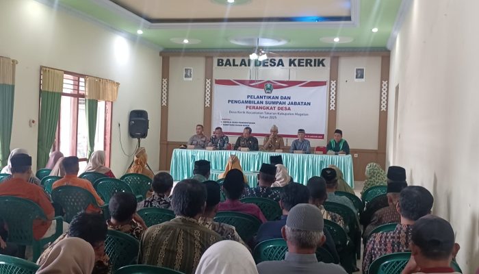 – Mari kita selalu panjatkan rasa syukur kehadirat Allah SWT sehingga kita dapat menghadiri pelaksanaan pelantikan perangkat desa Kerik yang baru dalam keadaan sehat