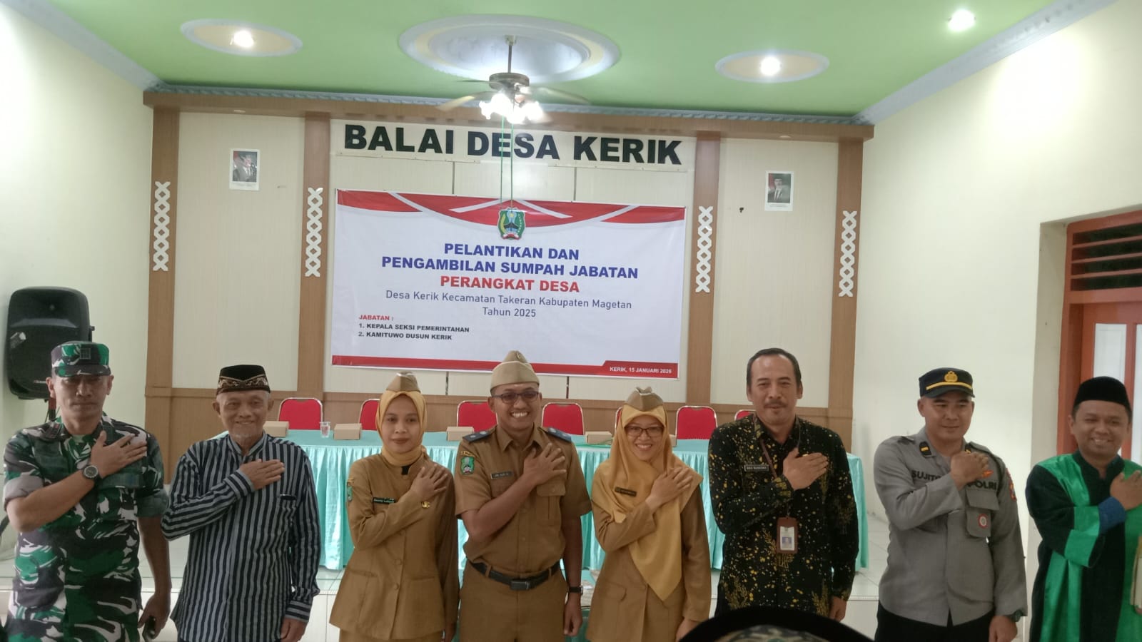 A. Pada hari Kamis tanggal 15 Januari 2026 pukul 09.00 s/d 10.30 Wib bertempat di Balai Desa Kerik Kec Takeran telah dilaksanakan kegiatan Pelantikan Perangkat Desa Kerik formasi Jabatan Kasi pemerintaha dan Kamituwo Dusun Kerik
