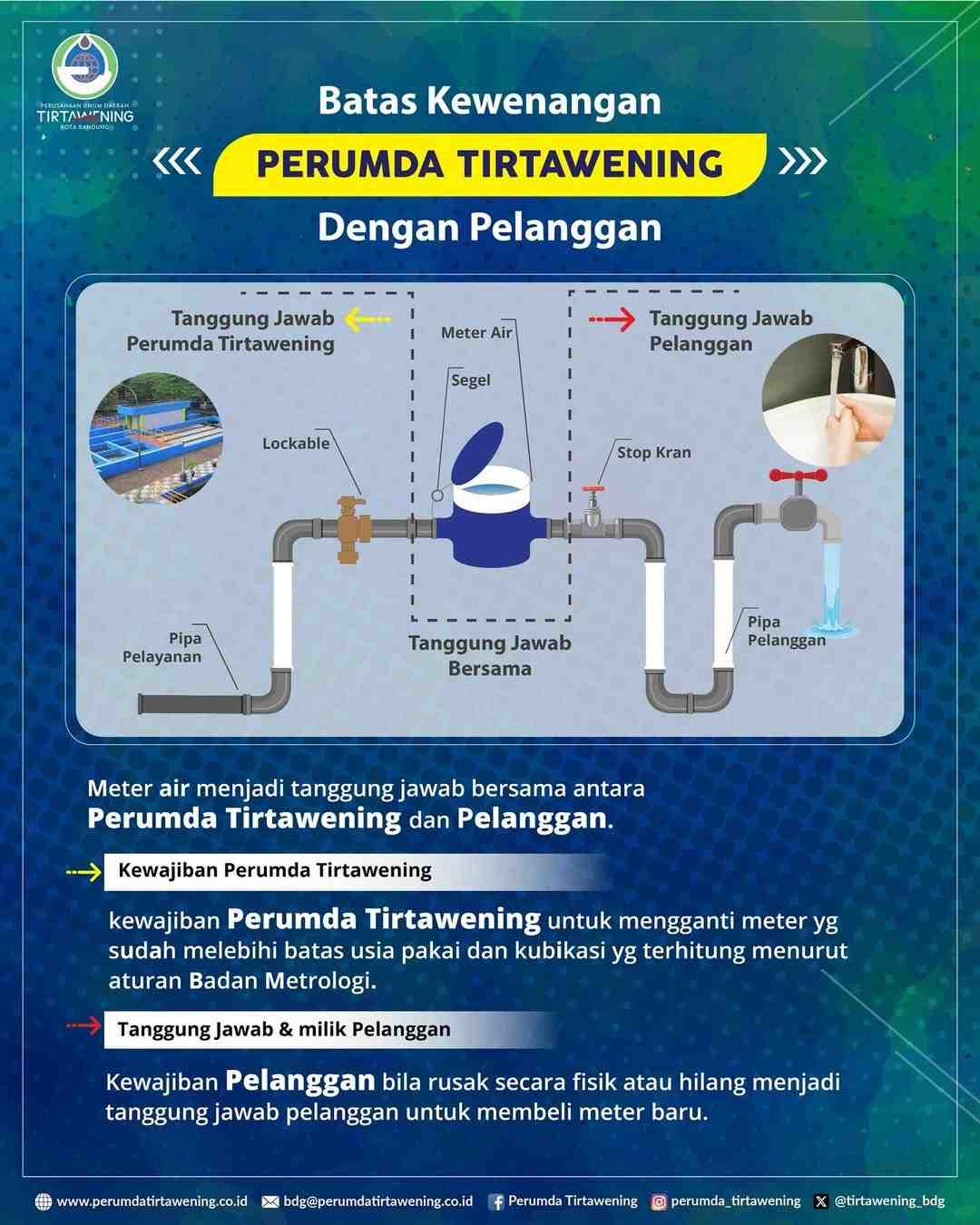 Perumda Tirtawening bertanggung jawab atas pipa pelayanan hingga meter air. Artinya, jika terjadi kebocoran atau gangguan pada jaringan pipa sebelum meteran, hal tersebut menjadi kewenangan Perumda.