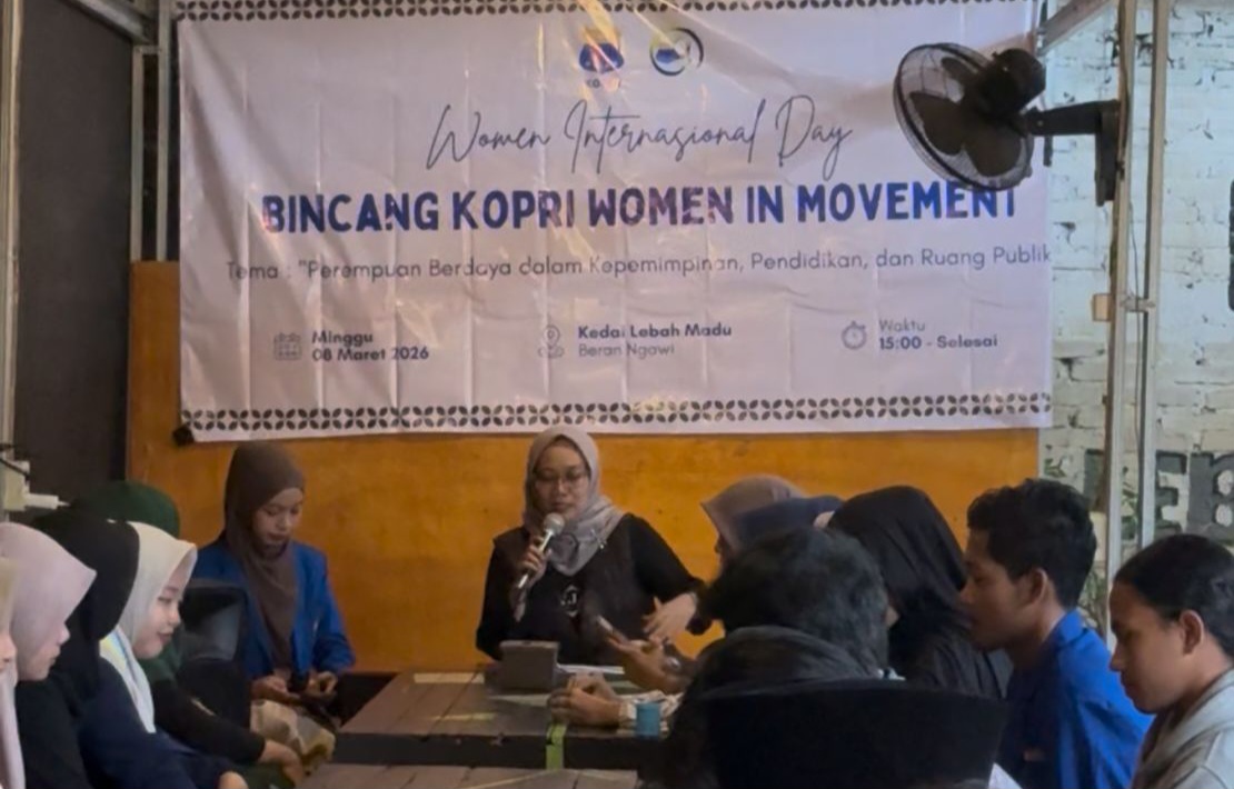 Ngawi — Dalam rangka memperingati International Women’s Day, kader perempuan dari Korps PMII Putri (KOPRI) yang berada di bawah naungan Pergerakan Mahasiswa Islam Indonesia (PMII) Cabang Ngawi menggelar diskusi bertajuk “Bincang KOPRI: Women in Movement” dengan tema Perempuan Berdaya dalam Kepemimpinan, Pendidikan, dan Ruang Publik.