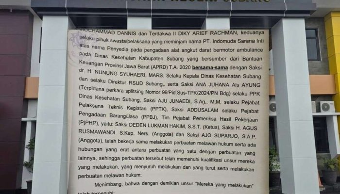 SUBANG, Globalindo.Net – Kasus dugaan tindak pidana korupsi (tipikor) dalam pengadaan mobil ambulans di Kabupaten Subang memasuki babak baru. Kuasa hukum tiga pihak terkait perkara ini mendesak agar penyelidikan tidak berhenti pada pelaksana teknis, tetapi diperluas hingga ke jajaran pimpinan di Dinas Kesehatan.