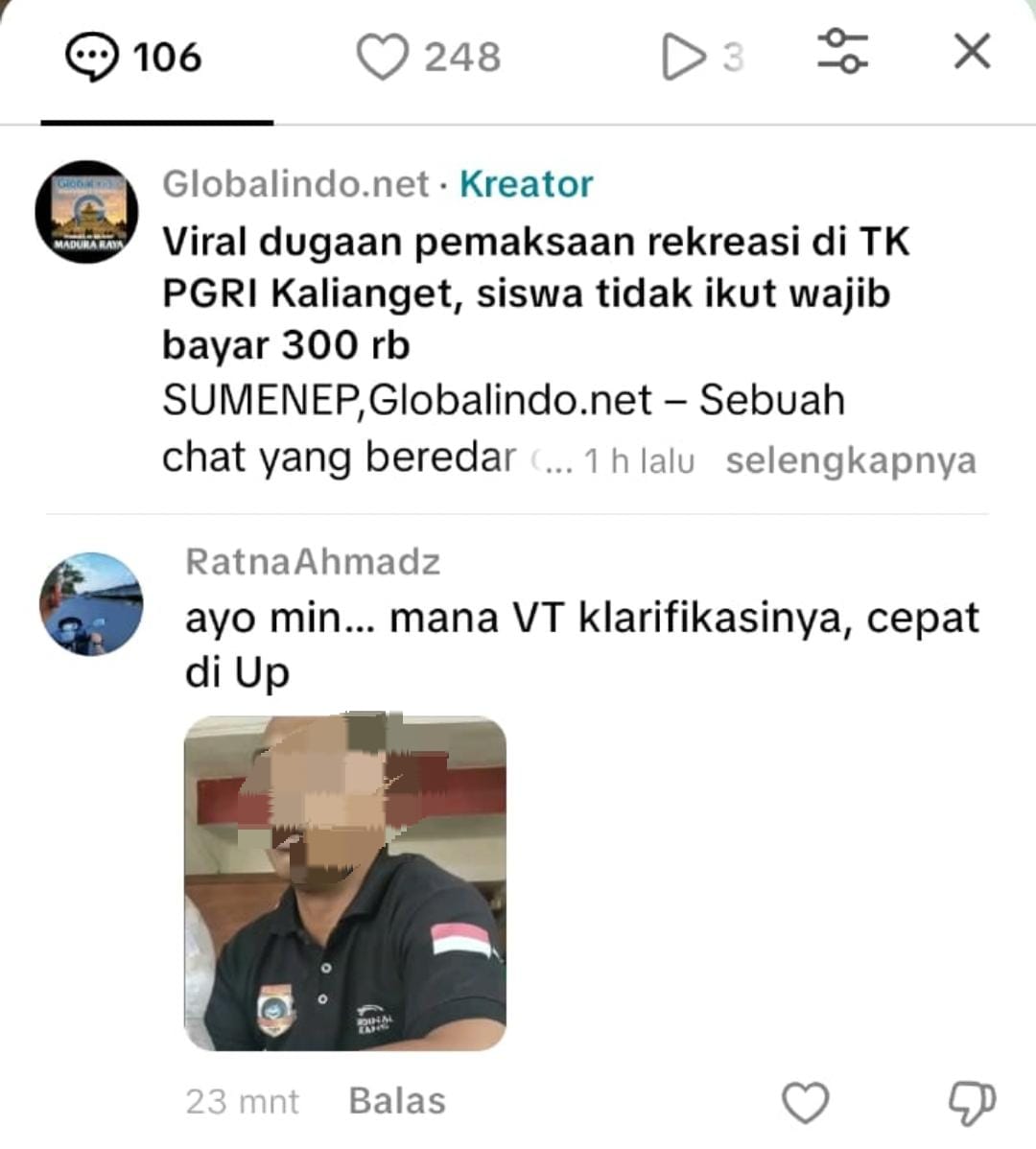 Tindakan tersebut dilakukan oleh salah satu pihak yang diduga sebagai guru atau wali murid yang sempat bertemu dan berdialog dengan wartawan media ini. Individu tersebut diketahui menyebarkan foto wajah wartawan melalui akun media sosial TikTok miliknya dengan nama pengguna ratna Ahmadz.